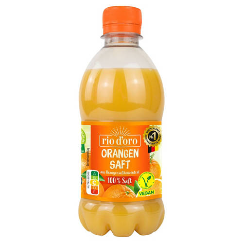 - Unsere 330 ml PET-Pfandflasche mit der Geschmacksrichtung Orange unter unserer bekannten Eigenmarke RIO D'ORO