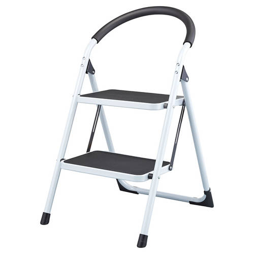 • Die klappbare Trittleiter ist in zwei Farbvarianten erhältlich: weiß und grau. Diese kann im Haushalt verwendet werden und der Aufstieg erfolgt über die beiden Stufen mit rutschfesten Profilen. Es gibt einen Sicherheitsmechanismus, der ein unbeabsichtigtes Einklappen der Leiter verhindert und der Tragegriff ist mit Schaumstoff überzogen. Die Leiter misst im aufgestellten und zusammengeklappten Zustand 46 x 59 x 82 cm bzw. 46 x 95 x 15 cm in Breite x Höhe x Tiefe und kann Lasten von bis zu 150 kg tragen