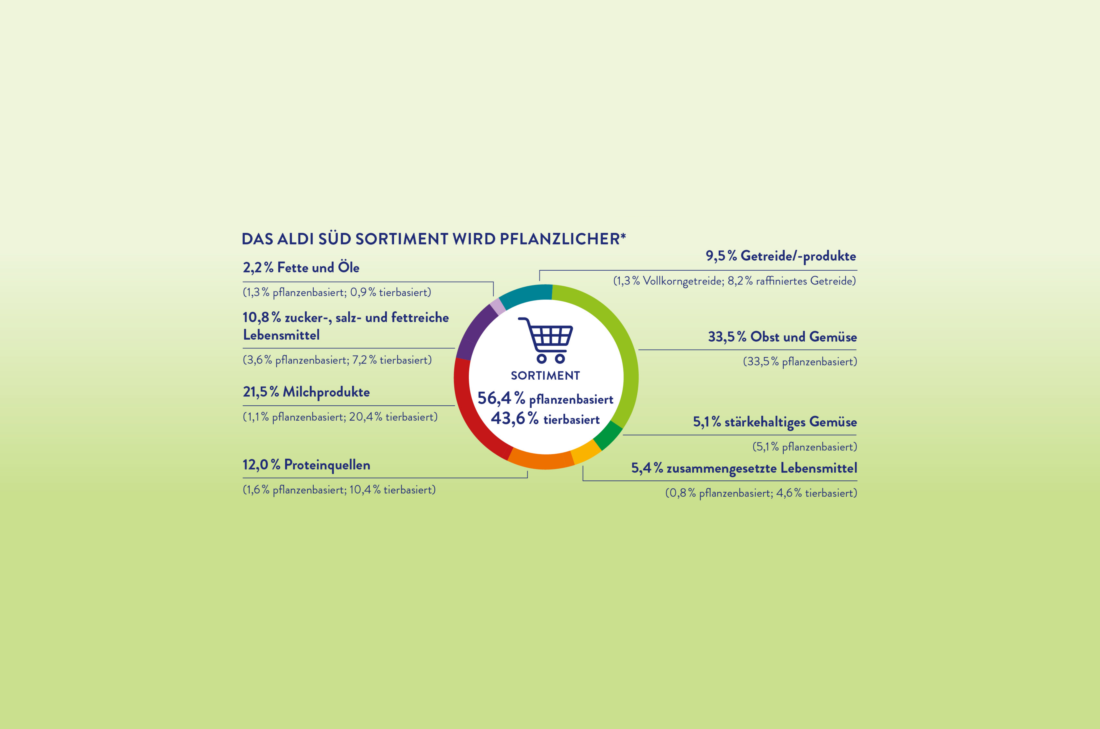 Bezogen auf das ALDI SÜD Food-Sortiment liegt der pflanzenbasierte Anteil bei 56,4 %, während sich der tierbasierte Anteil auf 43,6 % beläuft.*